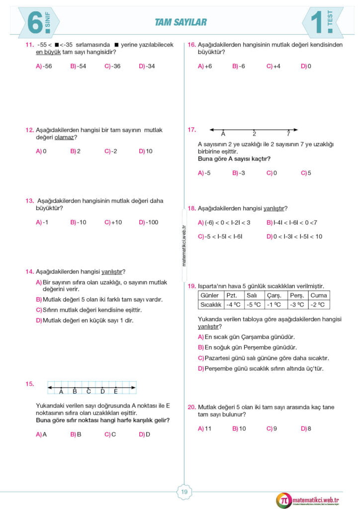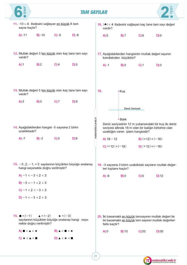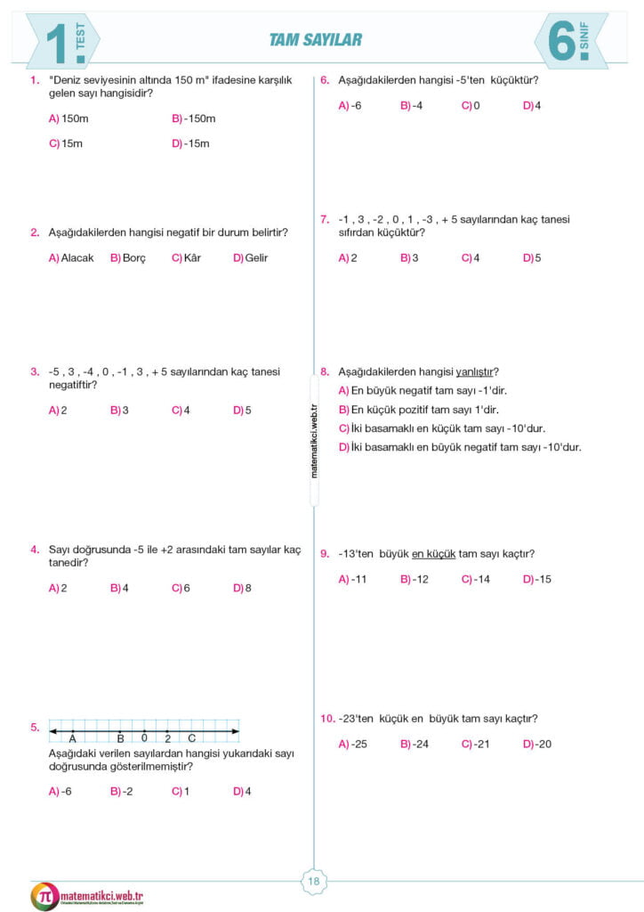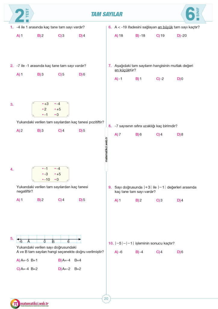 6.Sınıf Tam Sayı Kavramı Testi İndir